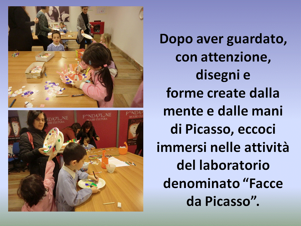 Presentiamo alcune immagini (diapositive) dell’uscita didattica effettuata dagli alunni della scuola dell’infanzia di Ripalimosani, nella giornata scolastica del   15 febbraio 2017, presso il Palazzo ex GIL  di Campobasso, per visitare la mostra “Picasso, l’intimità del genio” e prendere parte al laboratorio didattico denominato”Facce da Picasso”, organizzati, entrambi,  dall’associazione MuSE. Gli alunni sono stati abilmente coinvolti dalle guide che, attraverso l’uso di un lessico adeguato e  facendo leva sul loro bagaglio cognitivo, li hanno guidati lungo il percorso della mostra e durante le attività del  laboratorio. In maniera particolare, nelle attività didattiche del laboratorio prescelto, tutti gli alunni, dopo aver ammirato le opere dell’artista, hanno avuto la possibilità di realizzare,  nello spazio di un piatto, il loro ritratto, o altre immagini, con gessetti, pastelli a cera, pennarelli, colla, carta collage, fili di lana  e tanta creatività.