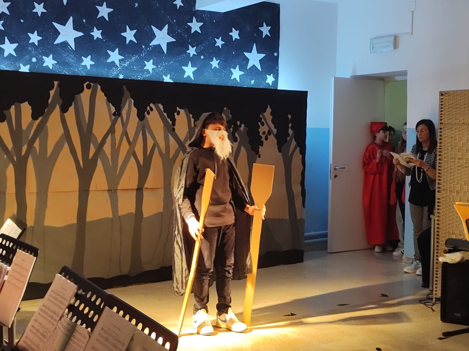 L’idea di rappresentare una commedia teatrale è balenata in classe nel mentre la docente di Lettere, prof.ssa Francesca Marcucci, spiegava ai ragazzi della classe seconda la Divina Commedia, della cui bellezza sono rimasti incantati. Sin da subito gli alunni hanno accettato la sfida, si sono messi in gioco e si sono immedesimati nelle parti assegnate.
